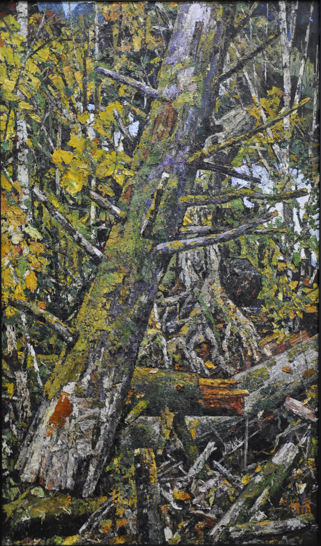 我在长白山树林里,看到许多倒在地上的朽木,它们有的躺下不久,有的满身是苔藓,有的成了蚂蚁窝,还有的已经和地上的泥巴烂树叶浑然一体了。我忽然心中一闪念,为什么不画一张朽木呢?这不公平呀,难道朽木就没有美感,不值得一看吗?我带着探索观察的眼光,欣赏了一处又一处形态多变的朽木,发现了过去从来不曾关注过的一种美的形态。朽木让我感悟到生命的过程,每一个阶段都是美的,只是我们片面浅薄的认知忽视了美的多样性。在这种情况下,我画了《朽木》一画,好赖也是一种尝试,请大家品评。