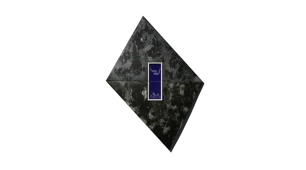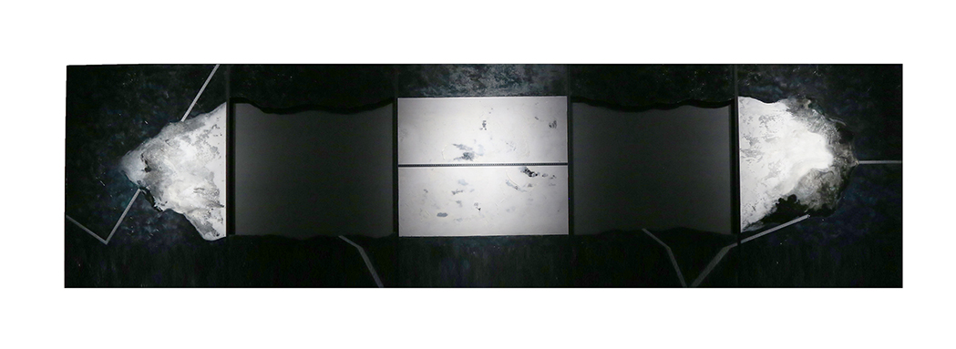 在一片深蒙的野山中,有一片被拉伸的白色空间。空缺的出现增加了运动的痕迹,标尺的加入,白色肌理的流动,黑色的沉默,构成了一幅令人沉思的画面。何处才是存在的本身?(游东醌自述)