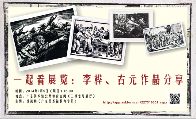 本次一起看展览活动,以分享的形式分别对 “新兴木刻运动”中两位领军人物李桦、古元的作品、人生经历进行深入解读。分析他们参与新兴木刻运动的前因后果,梳理这批粤籍版画家的创作活动,从而进一步确立他们在中国现代美术史中的地位及产生的影响。让观众更好地解读新兴木刻时期版画艺术作品。