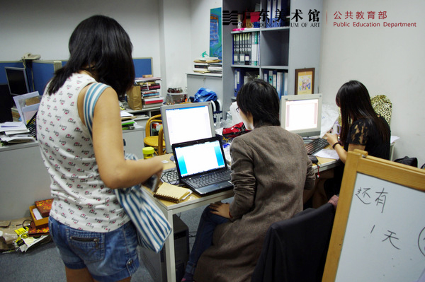 小编的话:每一次大型展览,都会有许多热爱艺术、对美术馆充满好奇的同学义无反顾地投身到繁忙的展览工作中来。志愿者、实习生,其实都一样,面对着遥远的上班路途、简陋的工作环境和繁琐的事务,他们都始终与馆员一起并肩作战。在这个短暂而又忙碌的过程中,我们感谢他们主动分担了一些工作,也为他们在工作中得到收获和成长而感到幸福。来自中山大学的化学研究生李键茹一直希望能够实现在美术馆做两件小事儿的愿望,为此她很积极地参加了许多与此相关的活动和培训。但因开学之后学业繁重,她差点儿就与三年展失之交臂了。皇天不负有心人,一次闲聊给她带来了实现愿望的机会。我们一起来听听她的故事吧!