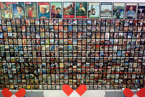 一进大门入口处,平常挂海报两层高的墙面成了“新历史小组”的展示空间。这是从二楼拍下去的。