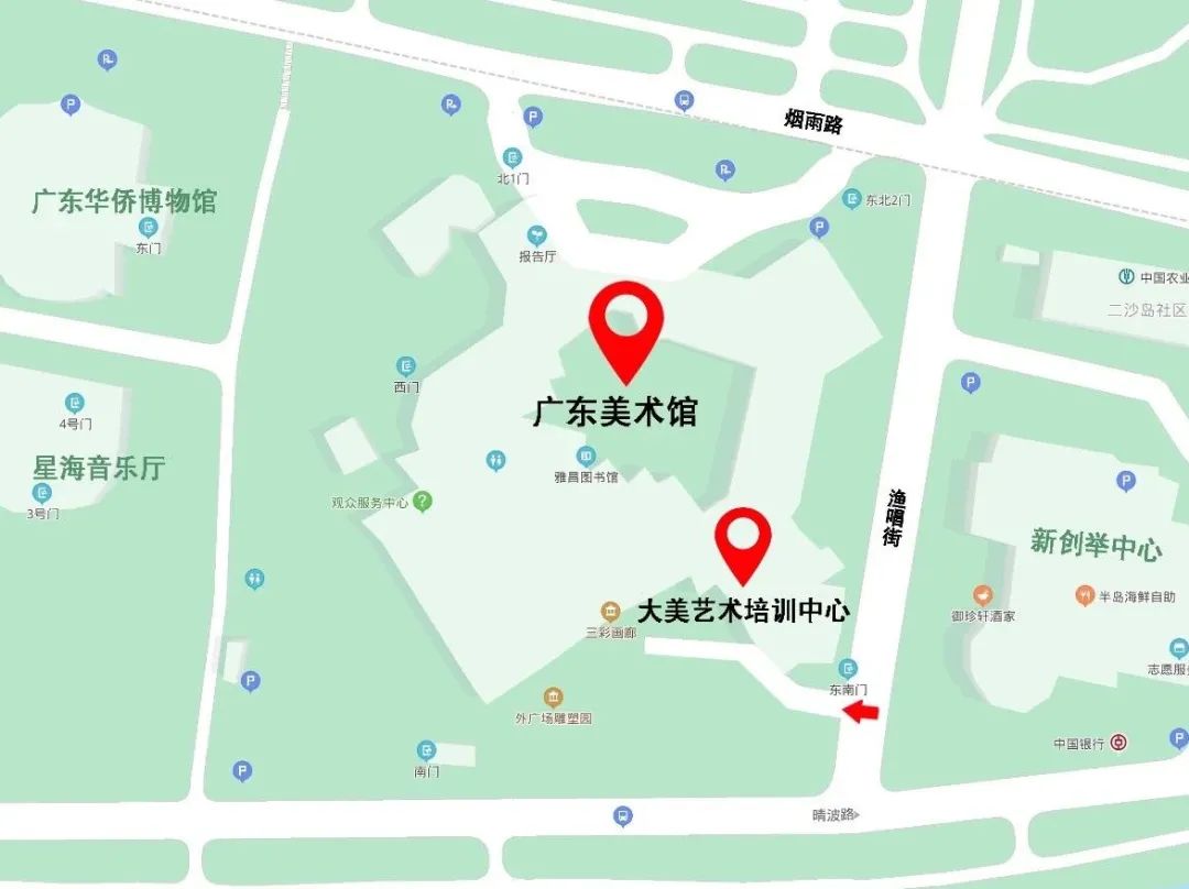 由 东南门(渔唱街)进入大美艺术培训中心教学区域,家长需将学员送到培训中心正门。
