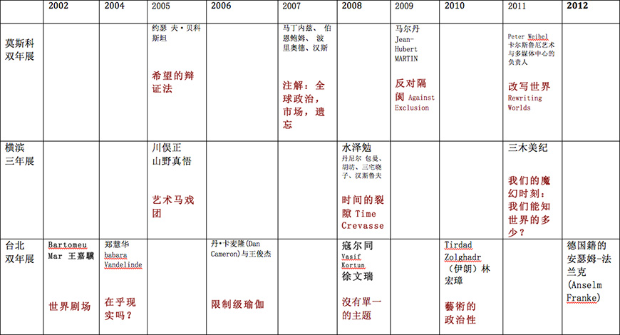 我仔细研究了从2002年开始到1012年十年间国际上各种双年展、三年展的展览主题、内容和策展人人选。最后形成了一个表格。做这个表格的过程,也是我理解这十年来国际策展领域的关注焦点的过程。
