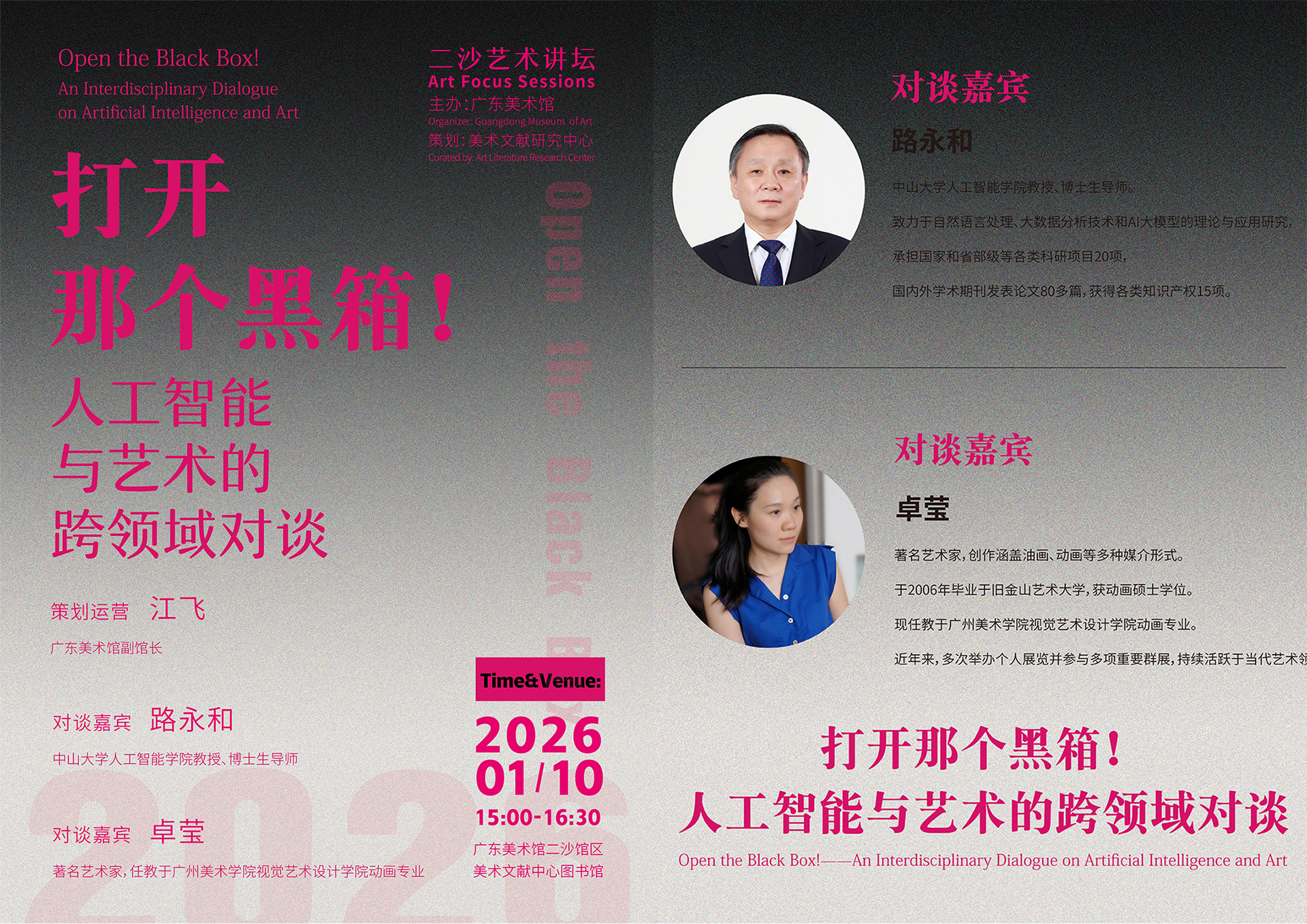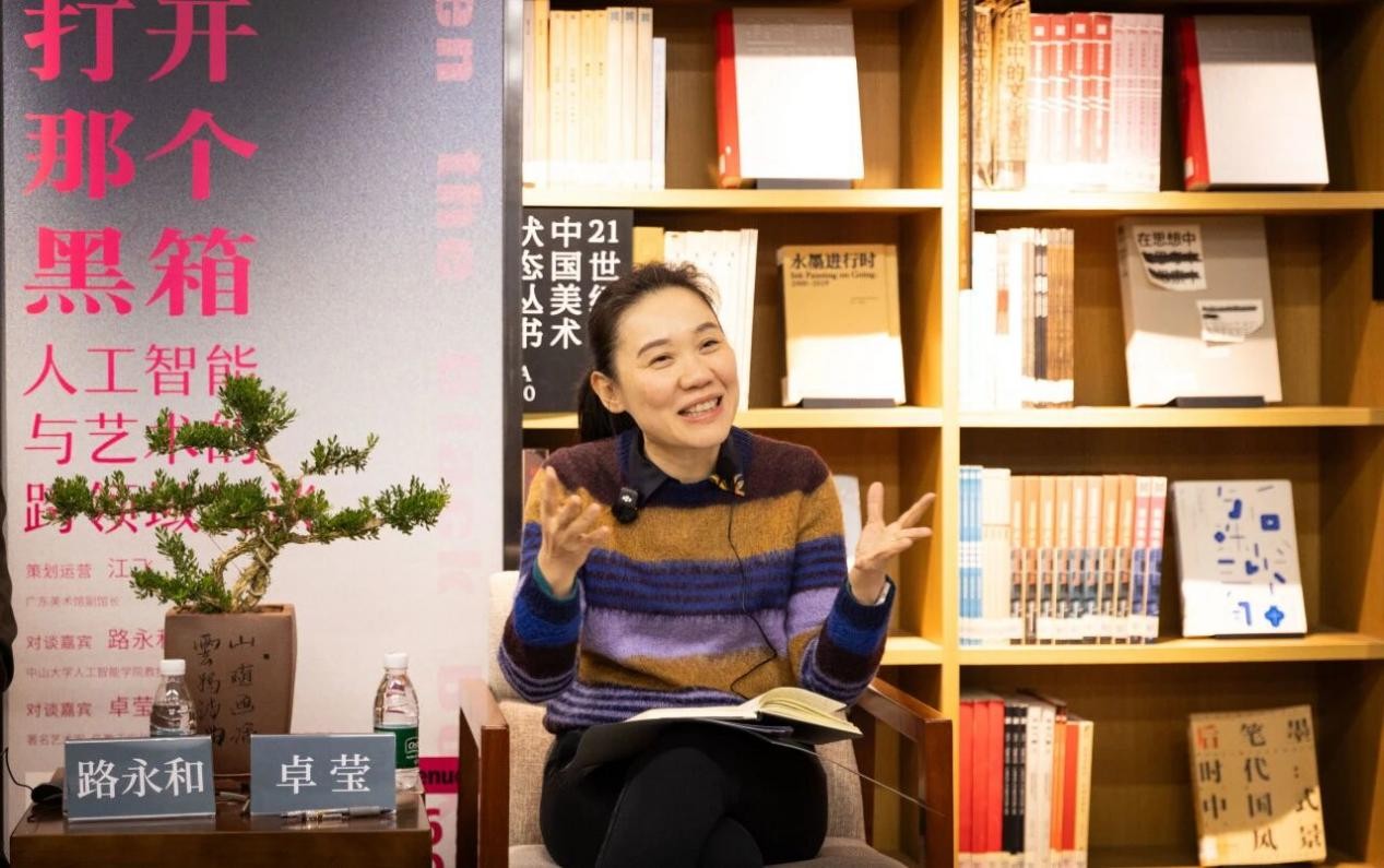 二沙本馆美术文献研究中心图书馆顺利举行。本期对谈以“打开那个黑箱!——人工智能与艺术的跨领域对谈”为题,特别邀请中山大学人工智能学院路永和教授和广州美术学院视觉艺术设计学院卓莹老师,共同展开一场技术与艺术的双向对话。