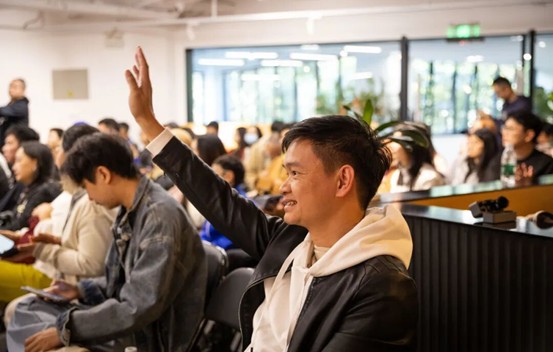 在互动环节中,嘉宾与现场观众展开了多轮深入对话,推动讨论在技术、艺术与哲学维度持续延展。现场提问气氛极为踊跃,共有八位观众先后获得发言机会,将现场氛围推向高潮。其中一位观众向路永和教授提问:“如果不具备编程或理科背景,应当从何入手学习人工智能?”路教授回应指出,普通人接触AI无需从复杂的计算机语言起步,更切实的路径是结合自身行业,从学习应用型AI模型开始,逐步理解技术逻辑与使用场景。为充分回应每位参与者的思考,本环节特别延长时间,让思想碰撞持续升温。现场交流节奏紧凑、气氛热烈,展现出观众对议题的高度投入与多元视角。