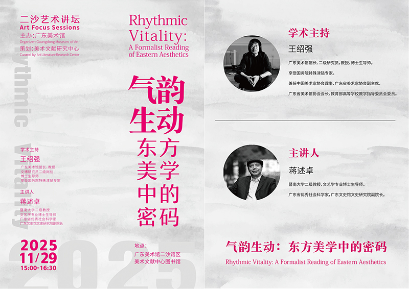 二沙本馆二楼的美术文献研究中心图书馆顺利举行。本期讲座以“气韵生动:东方美学的形式密码”为题,由暨南大学二级教授、博士生导师、广东省优秀社会科学家蒋述卓教授主讲。蒋教授深入浅出地从西方形式主义理论的角度切入对“气韵生动”概念的理解,从“六法”源流谈到形式主义,为我们审视中国绘画的独特旨趣提供了跨文化的新视野。