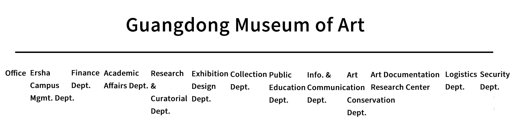 2.Ersha Campus Management Department: Also serves as the Party Committee Office. Responsible for the administrative management and logistical support of the Guangdong Museum of Art's Ersha Campus, including the compilation and exchange of administrative documents, cleanliness, pest control in green areas, water and electricity supply, property maintenance, and the operation and maintenance of equipment (e.g., air conditioning, elevators, security systems, fire protection, telephones, computers, network). Manages the daily upkeep and maintenance of fixed assets at the Ersha Campus. Liaises with the property service company for the Ersha Campus. Handles Party building, integrity initiatives, and mass organization affairs, undertaking daily tasks of the Party Committee Office and disciplinary inspection. Liaises with Guangzhou Damei Culture Development Co., Ltd.