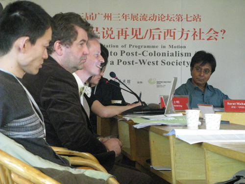 2007年11月,三年展提出了“通过视觉去思想”的口号,考察了艺术作为“具体知识”、“内在—视觉”知识的意义,辨析它与正在兴起的数据型知识之间的互动关系,这些意念始终贯穿在我们的一系列流动论坛之中。2008年11月14日至15日,三年展的最后一站——《与后殖民说再见/后西方社会?》——广州三年展流动论坛的第七站,回到
